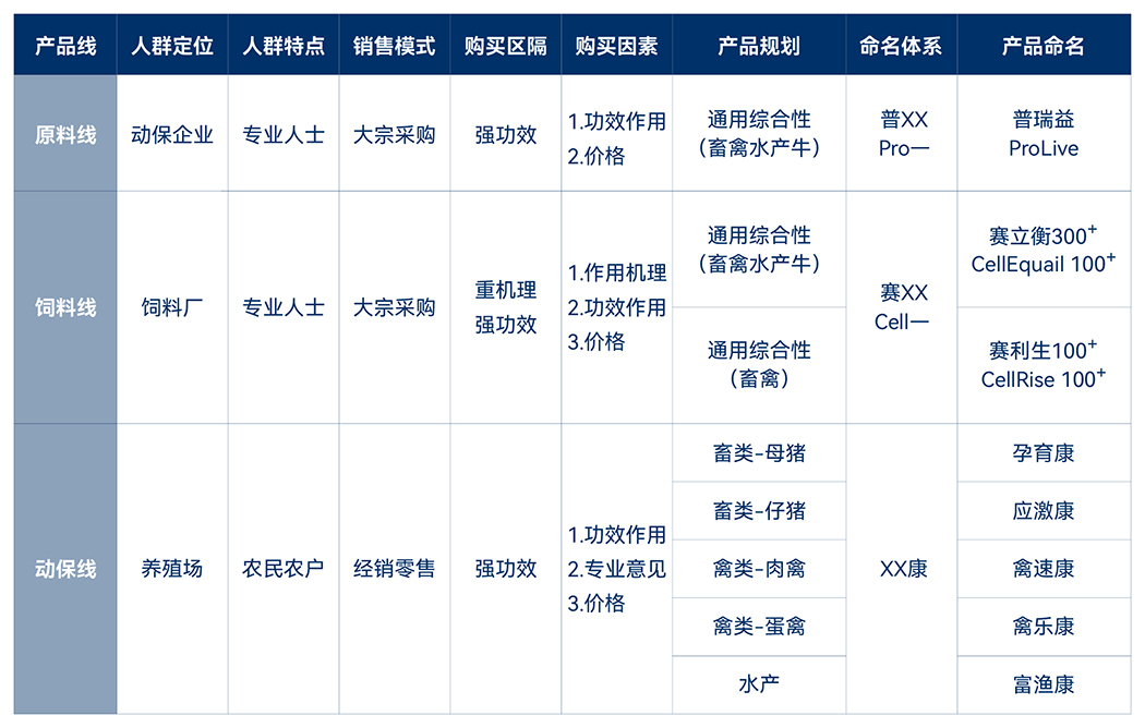 正午根據(jù)新品牌戰(zhàn)略對創(chuàng)博原有產(chǎn)品進(jìn)行了梳理,針對不同市場需求,將產(chǎn)品線分為飼料線、動保線和原料線,并對三大產(chǎn)品線進(jìn)行定位區(qū)隔。