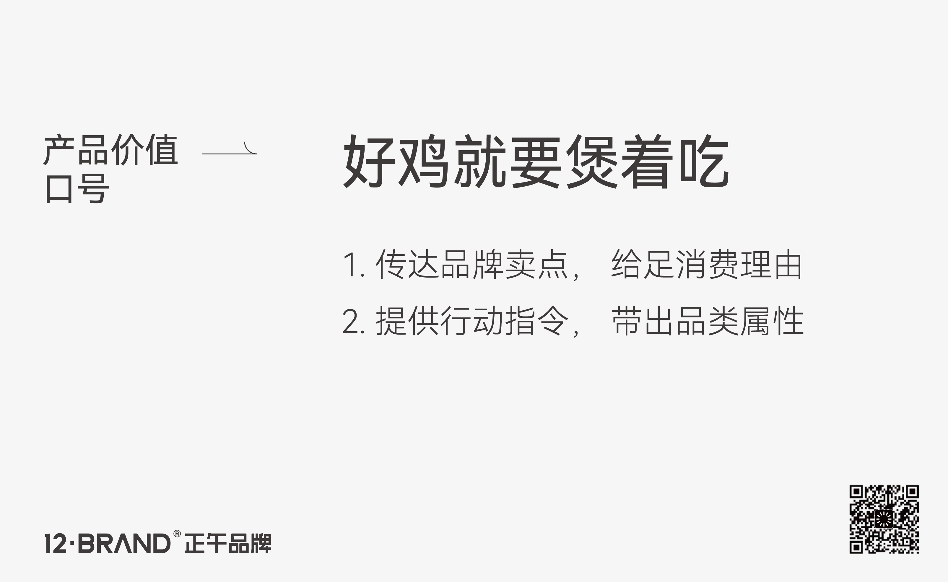 從產(chǎn)品價值角度,我們建立了品牌口號——“好雞就要煲著吃”,直接傳達出產(chǎn)品高價值賣點,鏈接食欲刺激消費,即給足消費理由,又帶出品類屬性。