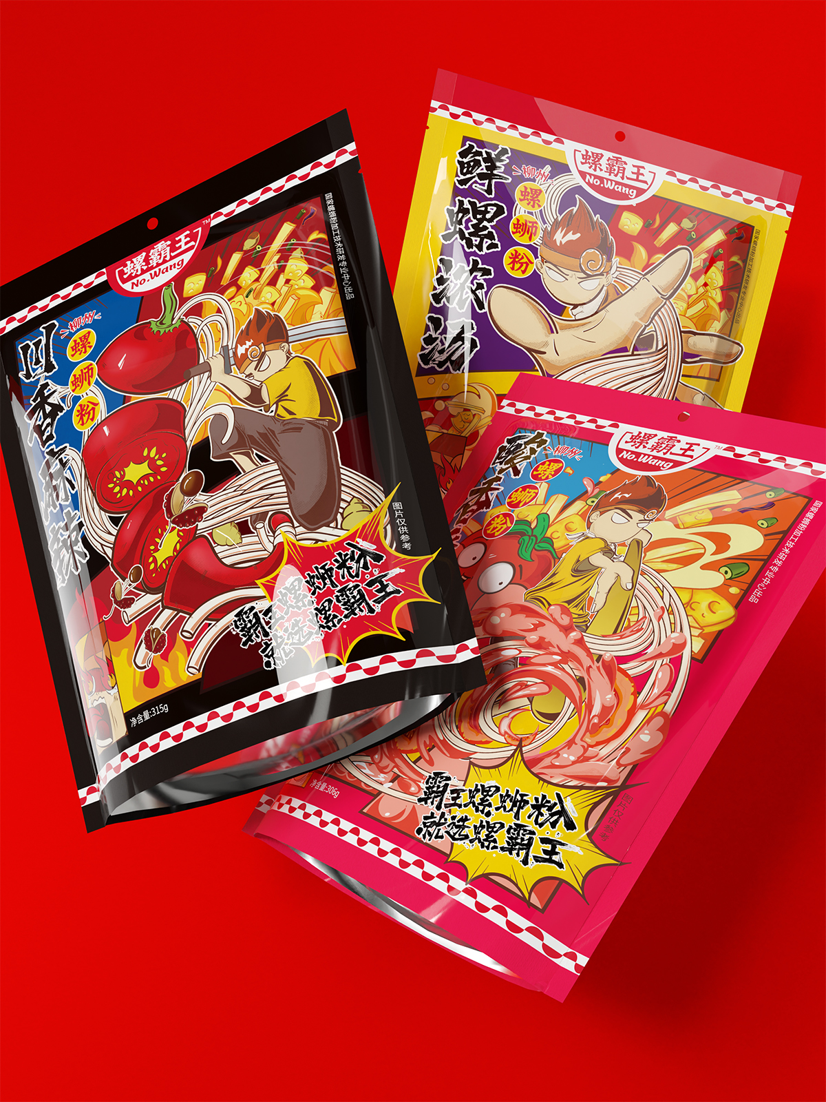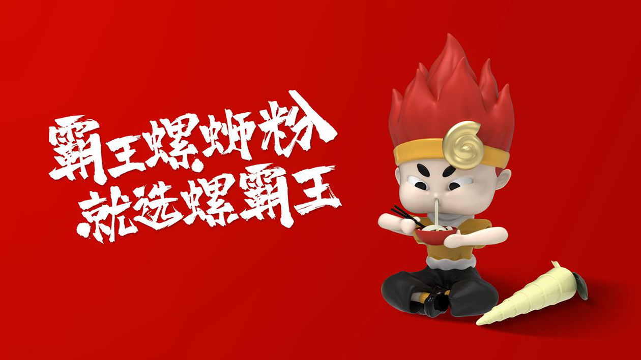 通過尋找消費者心智中的“霸王”文化印記,將螺螄粉的核心材料“螺”融入到人物特征設計中,構(gòu)建一個年輕人認同的率真、勇敢、張揚的IP形象,彰顯霸王氣質(zhì)。